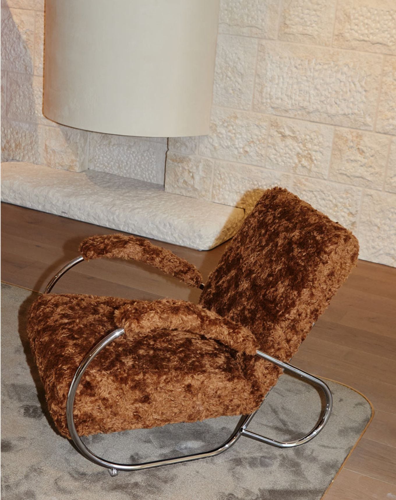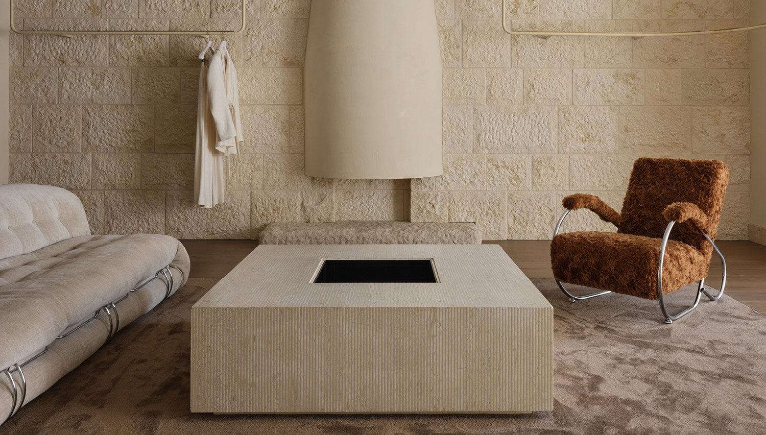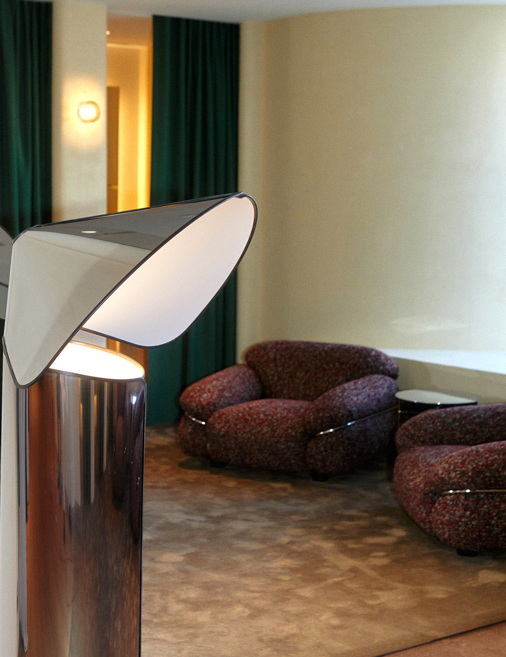 All furniture is vintage sourced, including an Italian Travertine Coffee Table from the 1980s, a lamp by Helena Frantova for Okolo in the 1950s, Modernist Pel Tubular Metal Armchair from the 1930’s, Sessann Armchairs by Gianfranco Frattini from the 1970s re-upholstered in a fabric called Atom by Raf Simons for Kvadrat.